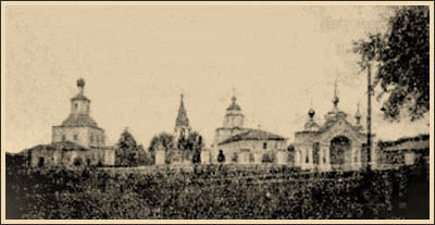 – двух церквей и колокольни. Холодная церковь во имя Сретения образа Владимирской Божией Матери строена в 1756 г., теплая во имя Архангела Гавриила и колокольня строены в 168 году. Строителем теплой церкви и колокольни был замечательный богач своего времени, прихожанин Владимирской церкви, торговый гость Гавриил Мартынович Фетиев, скончавшийся в 1683 году. В холодной Владимирской церкви есть несколько икон, носящих признаки весьма отдаленной древности, по крайней мере второй половины XV века. Таковы иконы: Всемилостивого Спаса Смоленского с припадающими к Нему Чудотворцами; храмовая Владимирской Богоматери; Сретения Владимирской иконы Божией Матери и икона Божией Матери
