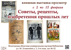 Книжно-иллюстративная выставка-просмотр «Советы, рецепты, изобретения прошлых лет» изданий рубежа XIX - начала XX веков откроется 2 февраля в зале № 12 Вологодской областной научной универсальной библиотеки им. И.В. Бабушкина (ул. М. Ульяновой, 1).
