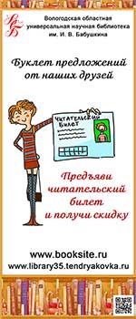 Вологжане, записанные в Областную библиотеку им. И. В. Бабушкина, смогут получать скидку на приобретение товаров или услуг в различных организациях города. Для этого нужно лишь предъявить свой именной читательский билет.