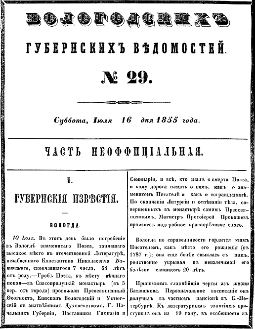 10 июля. В этот день было погребение в Вологде знаменитого Поэта, занявшего высокое место в отечественной Литературе, незабвенного Константина Николаевича Батюшкова, скончавшегося 7 числа, 68 лет от роду. Гроб Поэта к месту вечного покоя — в Спасоприлуцкий монастырь (в 5 верстах от города) провожали Преосвященный Феогност, Епископ Вологодский и Устюгский с знатнейшим Духовенством, Господин Начальник Губернии, Наставники Гимназии и Семинарии, и все, кто знал о смерти Поэта и кому дорога намять о нем как о знаменитом Писателе и как о согражданине. По окончании Литургии и отпевании телa, coвершенных в монастыре самим Преосвященным, Магистр Протоиерей Прокошев произнес надгробное красноречивое слово. Вологда по справедливости гордится этим Писателем как место его рождения (в 1787 г.); она еще более свыклась с ним, родственно укрывая в неизлечимой его болезни с лишком 20 лет. |