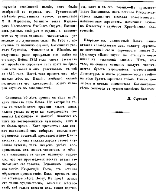 Припомним главнейшие черты из жизни Батюшкова. Первоначальное воспитание он получил в частном пансионе в С.-Петербурге. К литературным занятиям приступил он на 19 году, в особенности к изучению итальянской поэзии, как более сообразной со вкусом его. Руководимый советами родственника своего, знаменитого М. П. Муравьева, бывшего тогда Куратором Московского Учебного Округа, Батюшков развил свой ум и сердце, а знакомство с чужими странами окончательно утвердило его душевные силы. В 1806 г., поступив в военную службу, Батюшков увидел Германию, Финляндию и Швецию, но полученные раны принудили его выйти в отставку. Война 1812 года снова заставила его променять скромную лиру поэта на бранный меч воина, и он участвовал в ней до 1816 года. После того провел он несколько лет в Италии, любимой стране поэтических его вдохновений, язык которой изучил в совершенстве. С лишком 30 лет прошло с тех пор, как умолкла лира Поэта. Не смотря на то, что в течение этого времени язык наш далеко ушел по пути к совершенству, сочинения Батюшкова и поныне читаются с тем же восторженным чувством, как и в былое время. Хотя предметами для своих вдохновений он избирал иногда иностранных писателей, преимущественно Итальянских; но он владел даром такого глубокого чувства, так искусно умел воспроизводить их своим талантом и облекать написанное в такую изящную гармонию, что эти произведения носят печать самобытного его таланта. Вспомним, например, его элегию Умирающий Тасс, это истинно образцовое произведете. Как прозаик он не уступает места Поэту. В прозе язык его так же художествен, описания местностей, где только касался их, так же картинны, как и в его поэзии. В произведениях Батюшкова как истинно Русского писателя видны его высокая нравственность, пленительная скромность, пламенная любовь к Отечеству и глубокое Христианское благочестие. Напрасно ты, знаменитый Поэт наш, отдавая справедливую дань таланту других, по всегдашней своей скромности писал В. Пушкину: «Ваши внуки не отыщут моего имени в лексиконе славы». Нет, имя твое, по общему сознанию заслуг твоих, всегда будет украшением отечественной Литературы, а место родины — город твой — навеки будет гордиться тобою. Имена: колыбель и могила знаменитого Батюшкова — тесно сольются с существованием Вологды. Источник: Сорокин П. [Некролог] / П. Сорокин // Вологодские Губернские ведомости. – 1855. – 1 июля (№ 29). – С. 249–250. |