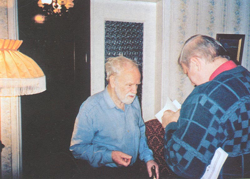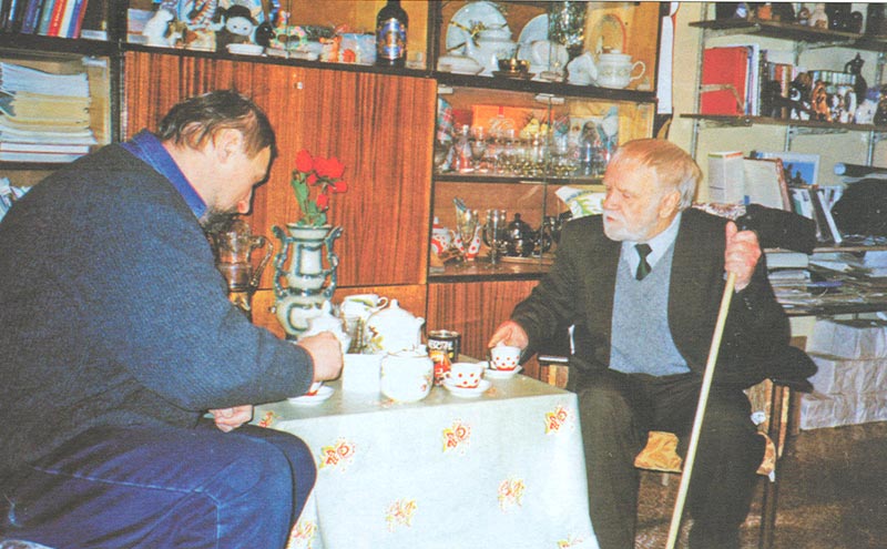 В. Белов беседует за чашкой чая с реставратором А. Рыбниковым |