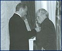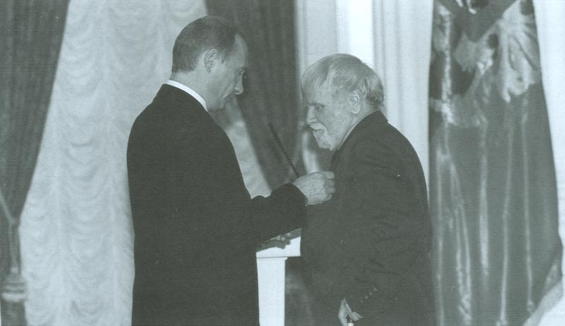 Президент РФ В. В. Путин вручает писателю Белову орден "За заслуги перед Отечеством". Москва, Кремль, 25 декабря 2003 года. |