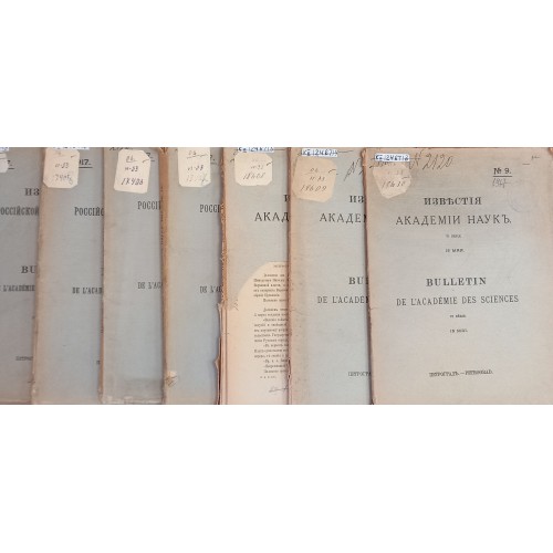 Журнал издавался в Российской империи начиная с 1894 года. В нем печатались Извлечения из протоколов заседаний Академии наук, краткие сообщения о научных трудах членов Академии, статьи членов Академии наук по различным отраслям знаний.(Журналы и газеты. Состояние удовлетворительное, потрепанные края страниц, в № 11 оторвана обложка, библиотечные штампы погашены, 300=00 за один номер, 19х26 см, 2240 гр. – вес комплекта)
