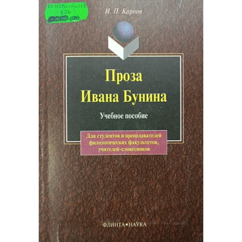 Карпов И. П. Проза Ивана Бунина: книга для студентов, преподавателей, аспирантов, учителей. – Москва: Флинта: Наука, 1999. – 335 с.: ил. –ISBN 5-89349-129-7
