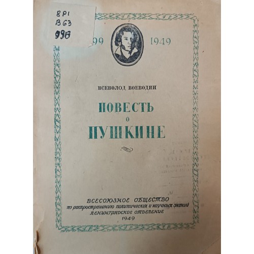 Воеводин В. Повесть о Пушкине. – Ленинград: Всесоюзное общество по распространению политических и научных знаний, 1949. – 160 с.