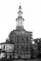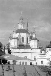 The nearby Church of the Nativity of Christ shows similar decorative and structural features, but its general appearance is quite different. Instead of the traditional five cupolas with a bell tower in the west, the structure is highly centralized, with an elongated series of octagons rising above the main structure in the manner of a spire. The refectory and porch are modest in comparison with this soaring vertical emphasis. Of special interest is the fact that this building, like a number of other eighteenth-century masonry churches in Totma, was constructed in the two phases: the lower, winter church was built in 1746-48, and the upper church was added in 1786-93. The lower church thus serves as a base for the great height of the upper church; but the design is so accomplished that this fusion of structures is unobtrusive. A free-standing bell tower, completed in the 1790s, was razed in the Soviet period (24).