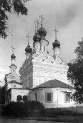 Space does not permit a thorough analysis of the monuments in this once flourishing but now distinctly provincial northern town. Among the best restored landmarks is the Church of the Trinity in Green Fishers' Quarter, near the Sukhona River. Like the Nativity Church, it was erected in two phases (1768-72 and 1780-88), with funds provided by the merchant Sergei Cherepanov. The master builder was a certain Fedor Titov, a free peasant. The church has since been restored to active use for the local Orthodox parish; its cupolas are once again in place, and its whitewashed brick walls, with the distinctive baroque scroll ornamentation of Totma's late eighteenth-century churches.