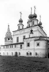 The low-relief, scrolled baroque ornament on the tower is traced in black in a manner reminiscent of the town's most famous craft technique-niello. Two decades ago this church was still being used as a saw mill because of its location on the bank of the Sukhona River. It has since been restored on the exterior, and is now used as a gallery to display the work of local painters (17).