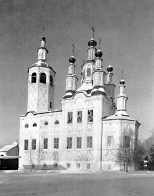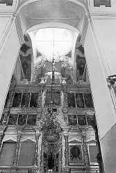 The wealth of local merchants led to yet another series of donations to monastery churches, some of which gained elaborate gilded iconostases that reveal a northern interpretation of European baroque art. One of the best examples is Trinity Cathedral at the Trinity-Gleden Monastery. Although visible from Velikii Ustiug, the monastery is situated some five kilometers to the southwest on the opposite bank of the Sukhona. Established no later than the middle of the thirteenth century, the monastery consisted entirely of wooden structures, including three log churches, for the first four centuries of its existence (18). Its earliest masonry structure is the rebuilt Trinity Cathedral, begun in 1659 with the support of donations by Sila and Ivan Grudtsyn, members of one of Ustiug's wealthiest merchant families. Subsequent financial and legal difficulties after the death of the brothers halted construction for much of the 1660s until 1690. The structure was finally completed only at the end of the seventeenth century (19).
