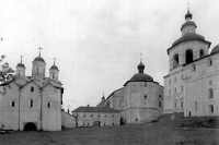 With the rise of the Muscovite principality in the fourteenth century and the establishment of a metropolitanate of the Orthodox Church in Moscow itself, the church began to play an essential role for the advancement of Moscow's position in this area of the north. In particular, the founding of monasteries by clerics from Moscow's own monasteries provided not only places of spiritual refuge and retreat, but also centers of Muscovite influence. The two most influential of these monastic institutions, and the sites of the earliest extant masonry structures in the area, are the St. Kirill Belozerskii Monastery, and the nearby Ferapontov Monastery (1). Both are located considerably to the north of Vologda, near the confluence of the Sheksna River and the White Lake (Beloe ozero). This water network connected the monasteries to the central regions of Muscovy, as well as to Vologda, and endowed them with a strategic importance that aided their growth as Moscow's outposts.