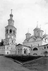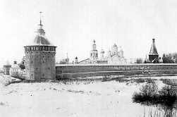 The first monastery, formally dedicated to the Dormition of the Virgin, was founded in 1397 on Siverskoe Lake, seven kilometers to the east of the Sheksna River. Its founder, Kirill (Cyril; 1337-1427), was a monk of noble birth who had served at the Simonov Monastery in Moscow and in 1390 became its hegumen. By leaving this prestigious position and coming to the northern territory of Muscovy in 1397, he not only achieved the ascetic life valued by the pioneers of Muscovite monasticism, but he also furthered territorial claims of the Moscow grand prince. As one who frequently advised the sons of Dmitrii Donskoi, Kirill was familiar with the political conditions that drove Moscow's northern expansion. Indeed, the monastery's importance as both a religious center and as an anchor of Muscovy's northern flank was recognized by the canonization of Kirill in the fifteenth century and the naming of the entire monastic ensemble- consisting of two adjacent monasteries, the Dormition and John the Baptist-for St. Kirill Belozerskii (2).