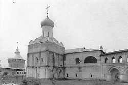 As the sixteenth century progressed the St. Kirill Belozerskii Monastery received major donations that made it one of the largest such institutions in Russia, second in size only to the Trinity-St. Sergius Monastery near Moscow. In 1519 the monastery refectory and its attached Church of the Presentation of the Virgin were rebuilt in brick. The church itself is situated at the eastern end of the refectory axis, with a polygonal east wall elevated on a high socle and originally culminating in rows of kokoshniki, over which was a single brick drum and cupola (Photo 27). The interior of the church was cruciform in shape, with a groin vault. Unfortunately, the original vaults and upper structure disappeared with subsequent rebuilding, but the height of the east wall suggests an early development in the design of tower churches that would play such a distinctive role in sixteenth-century Muscovite architecture.