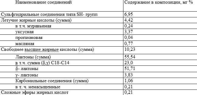 Одновременно установлено, что в формировании вкусового букета вологодского масла участвует комплекс веществ содержащийся в исходных сливках, и образующейся при их пастеризации. Это свободные сульфгидрильные соединения, аминокислоты, карбонильные соединения, лактоны, летучие жирные кислоты и др. Эти данные были подтверждены дальнейшими исследованиями ВНИИМС (таблица 3).