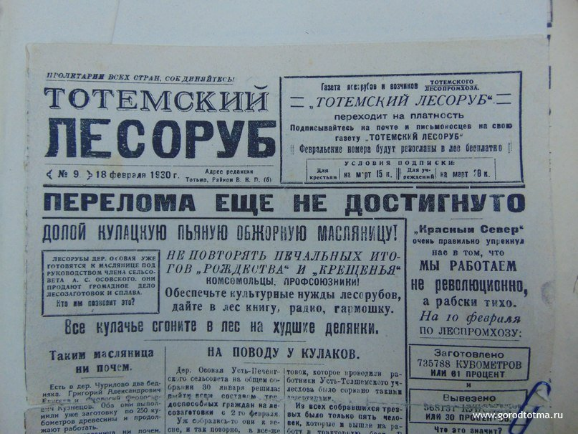 4 декабря – 95 лет назад (1929) вышел первый выпуск газеты Тотемского района «ТОТЕМСКИЙ ЛЕСОРУБ» (ныне «Тотемские вести»). Подробнее