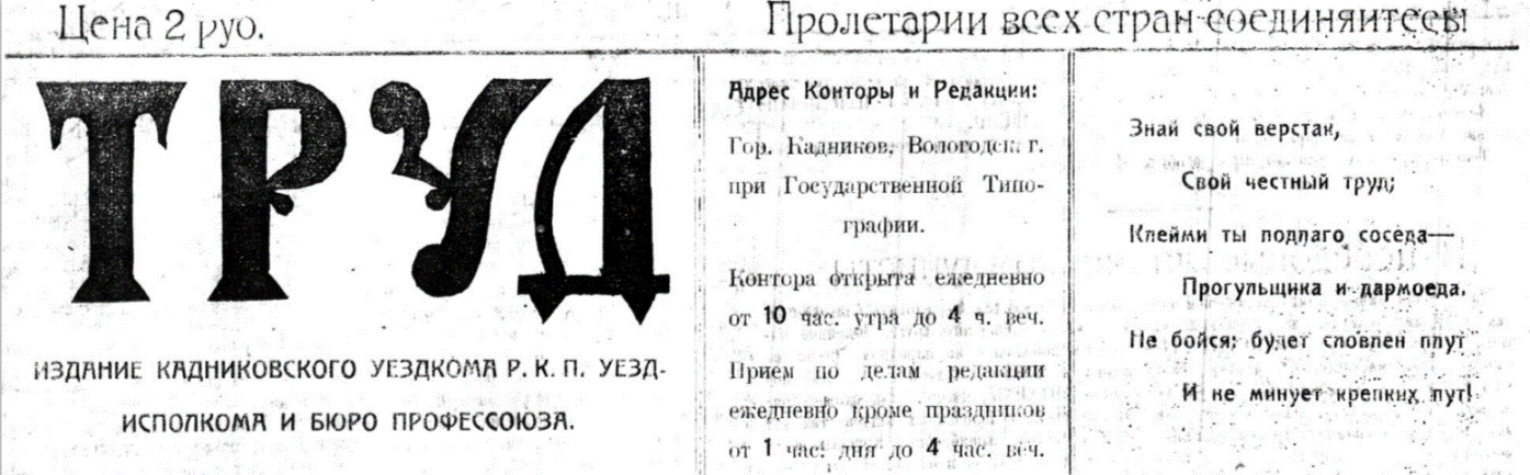 1 мая – 105 лет назад (1920) вышел первый номер ГАЗЕТЫ «ТРУД» – издания Кадниковского уездного комитета партии, исполкома и бюро профсоюзов (ныне «Сокольская правда»). Подробнее