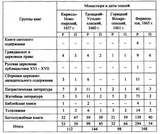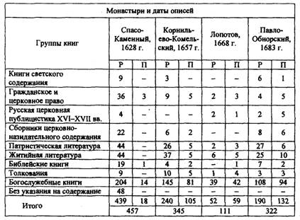 Общее количество книг в названных библиотеках колеблется от 98 в Горицком монастыре (опись 1661 г.) до 457 в Спасо-Каменном монастыре (опись 1628 г.). Подобный объем книжного фонда является достаточно распространенным для монастырей Русского Севера XVII в.