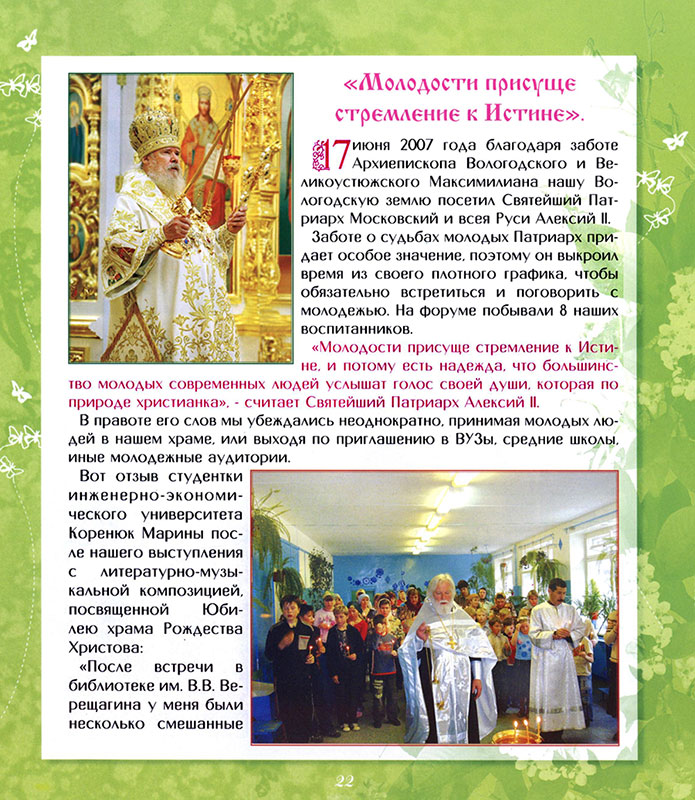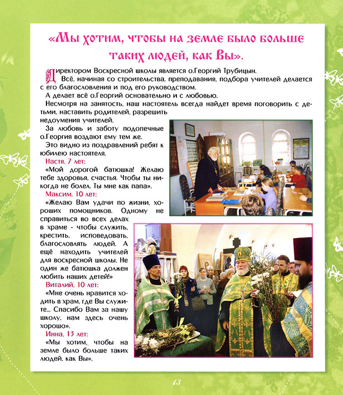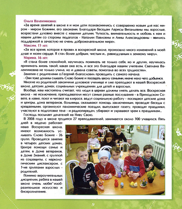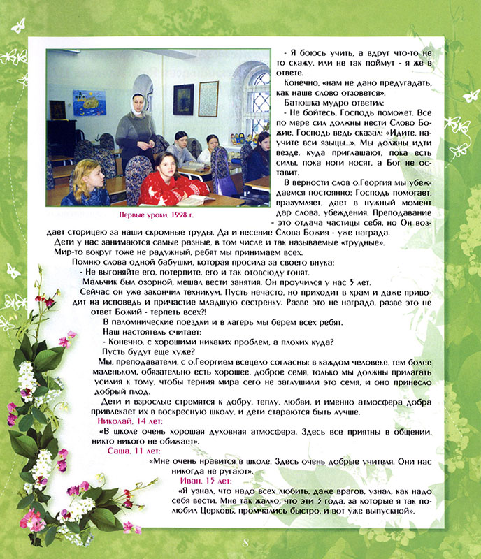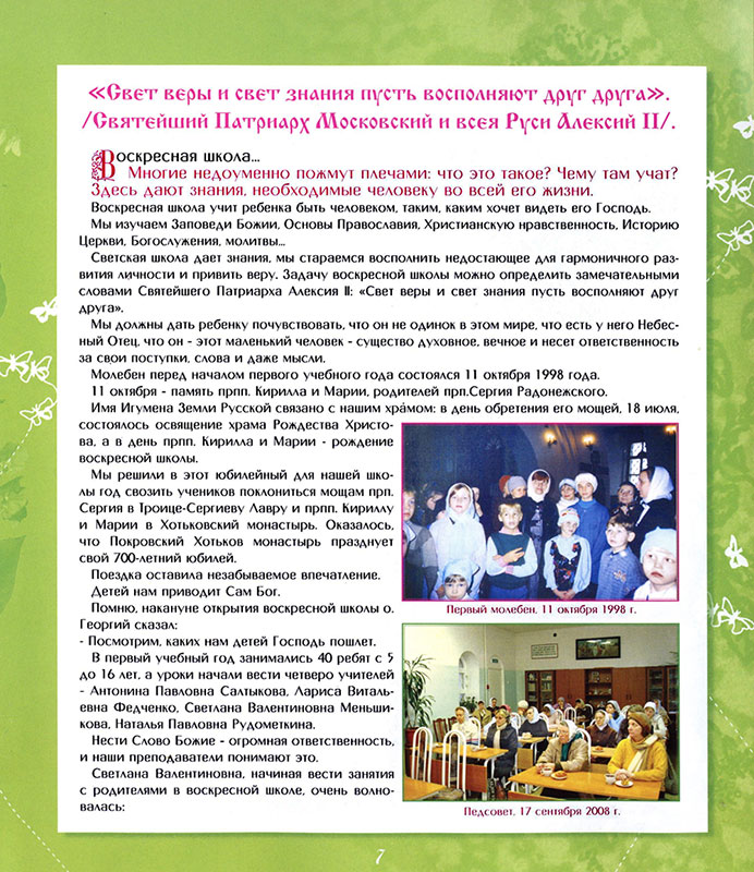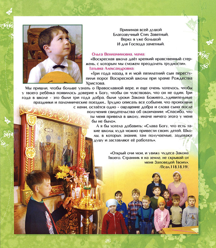 Источник: Православной Воскресной школе храма Рождества Христова 10 лет / [ред.-сост. : Л.В. Федченко; стихи: Н.К. Смирнов; фот.: Л.В. Федченко, диакон Димитрий Малинкин; отв. за вып. протоиерей Георгий Трубицын]. – Череповец : [б. и.], 2008. – 27 с. : цв. ил.Духовное образование• Церковно-приходские школы |