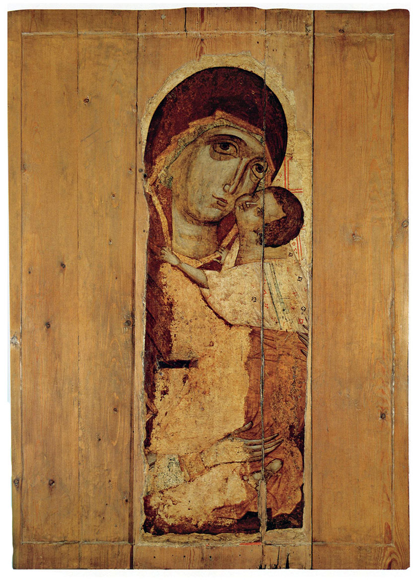 Икона: древняя часть иконы состоит из двух досок – липовой и сосновой. При реставрации 1970-х гг. были удалены две крайние сосновые доски, которые в XVI в. заменили утраченные первоначальные (доски с живописью XVI в. и пазами от двух врезных односторонних шпонок хранятся отдельно); взамен изготовлены две новые доски. На торцах древних досок остатки деревянных гвоздей, крепивших накладные торцовые шпонки; следы накладных тыльных шпонок; две поздние врезные шпонки. Ковчег, паволока, левкас, темпера.