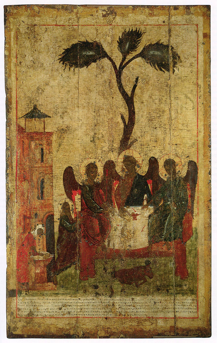 Изображение: менее половины площади средника занимает изображение Троицы. В левой части композиции помещено розовое трехъярусное строение, завершено башенкой-киворием. На фоне строения изображена Сарра, готовящая тельца, а правее – выходящий из черного проема здания Авраам с чашей. Над ангелами представлен Мамврийский дуб с широко раскинутыми ветвями.