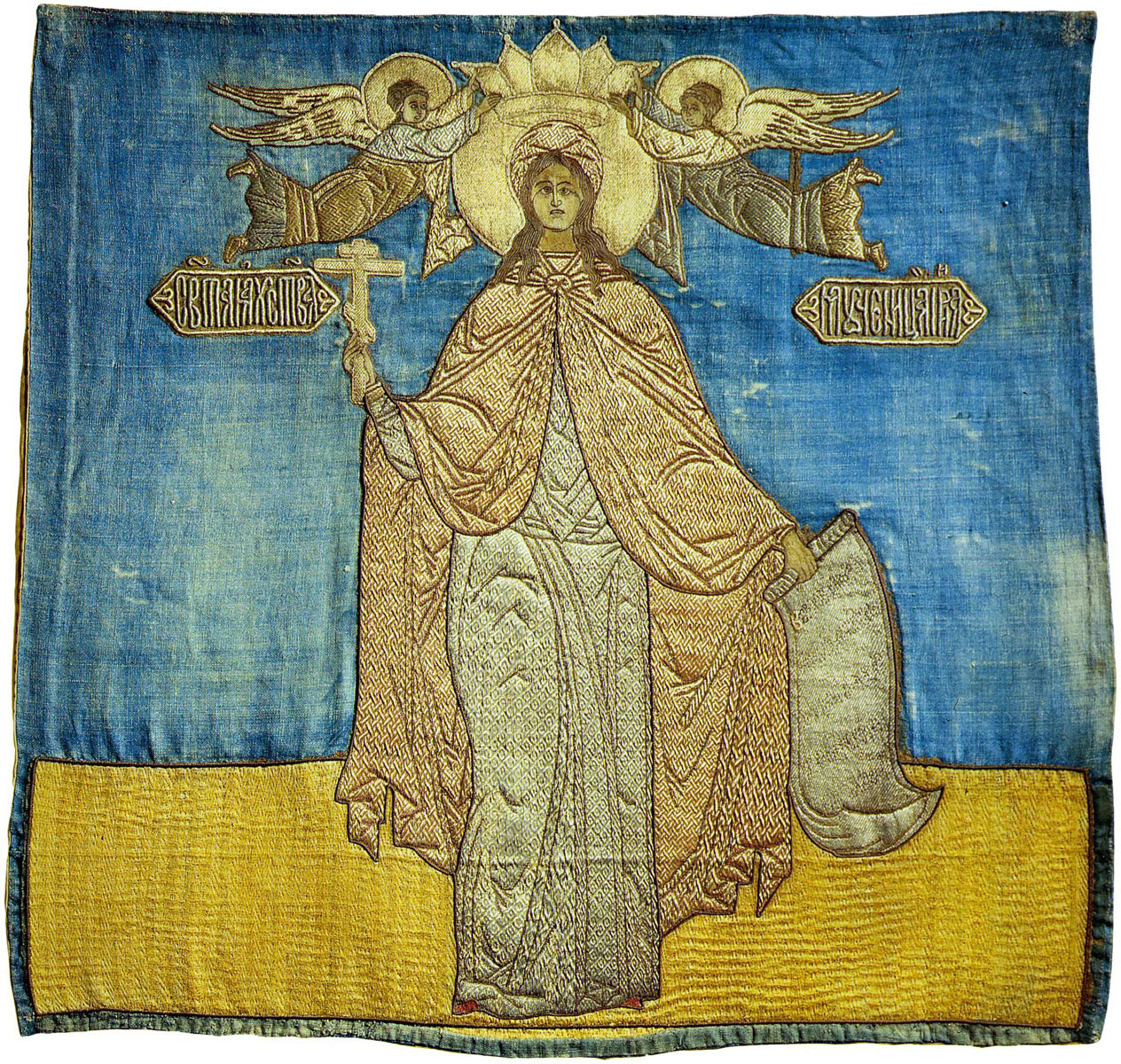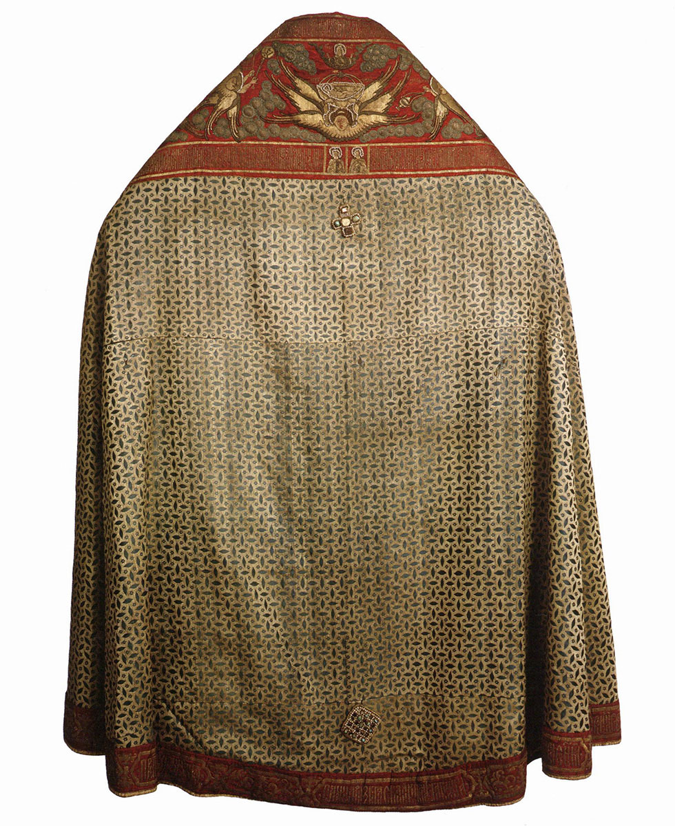 Размер: 68 х 70,5. Камка, шитье золотными, серебряными и шелковыми нитями.