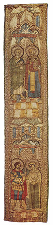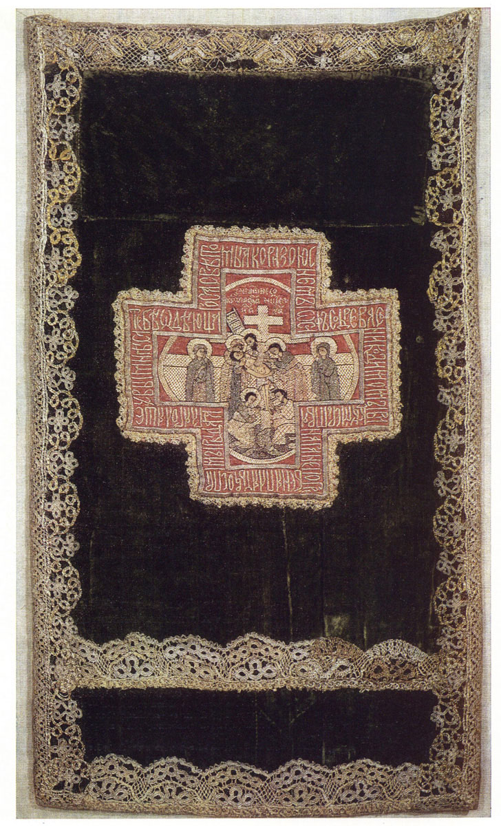 Размеры: 227,0 х 32,0. Диаметр овального клейма – 15,5 х 13,5; кресты – 31,0 х 13,5. Тафта, камка (Италия), объярь (Турция), холст; шелковые, серебряные и золотные нити, золотные тесьма и кружево; шитье.