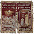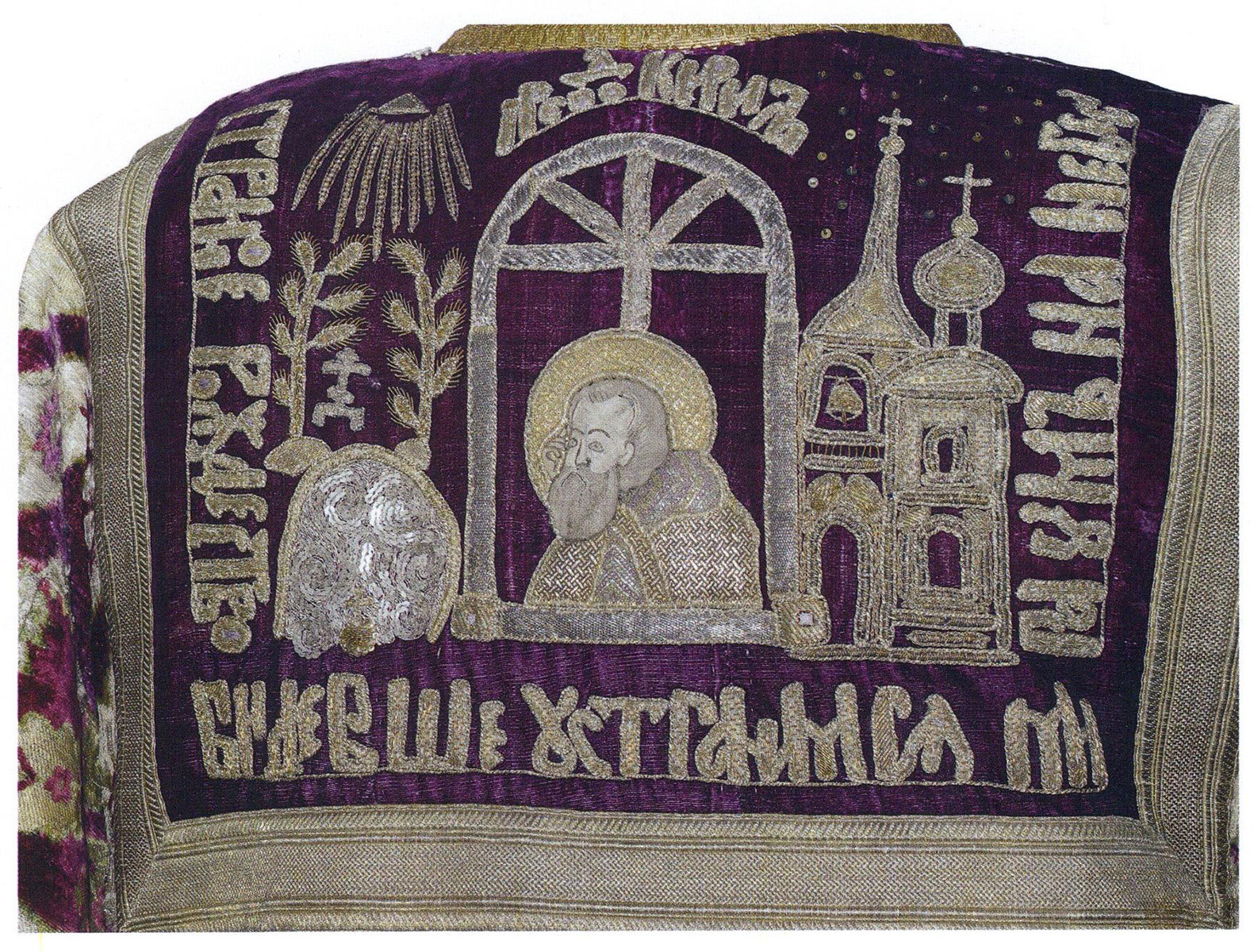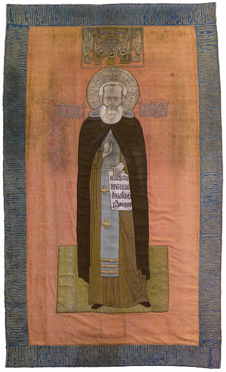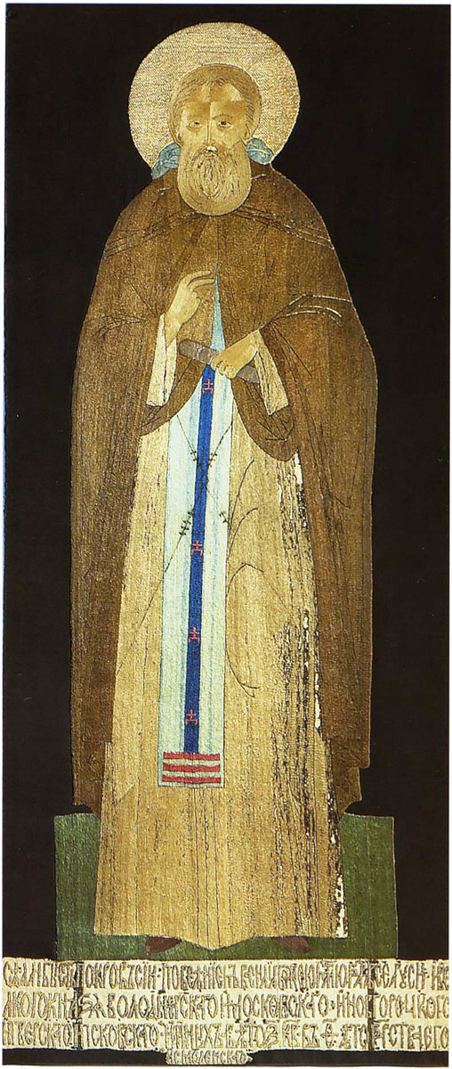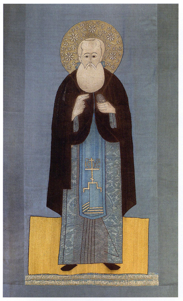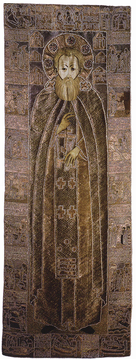 Надписи: ИЖЕ ДОБРОДЕТЕЛИ ПОДВИЖНИК… (тропарь прп. Сергию Радонежскому вышит пряденым серебром на каймах).