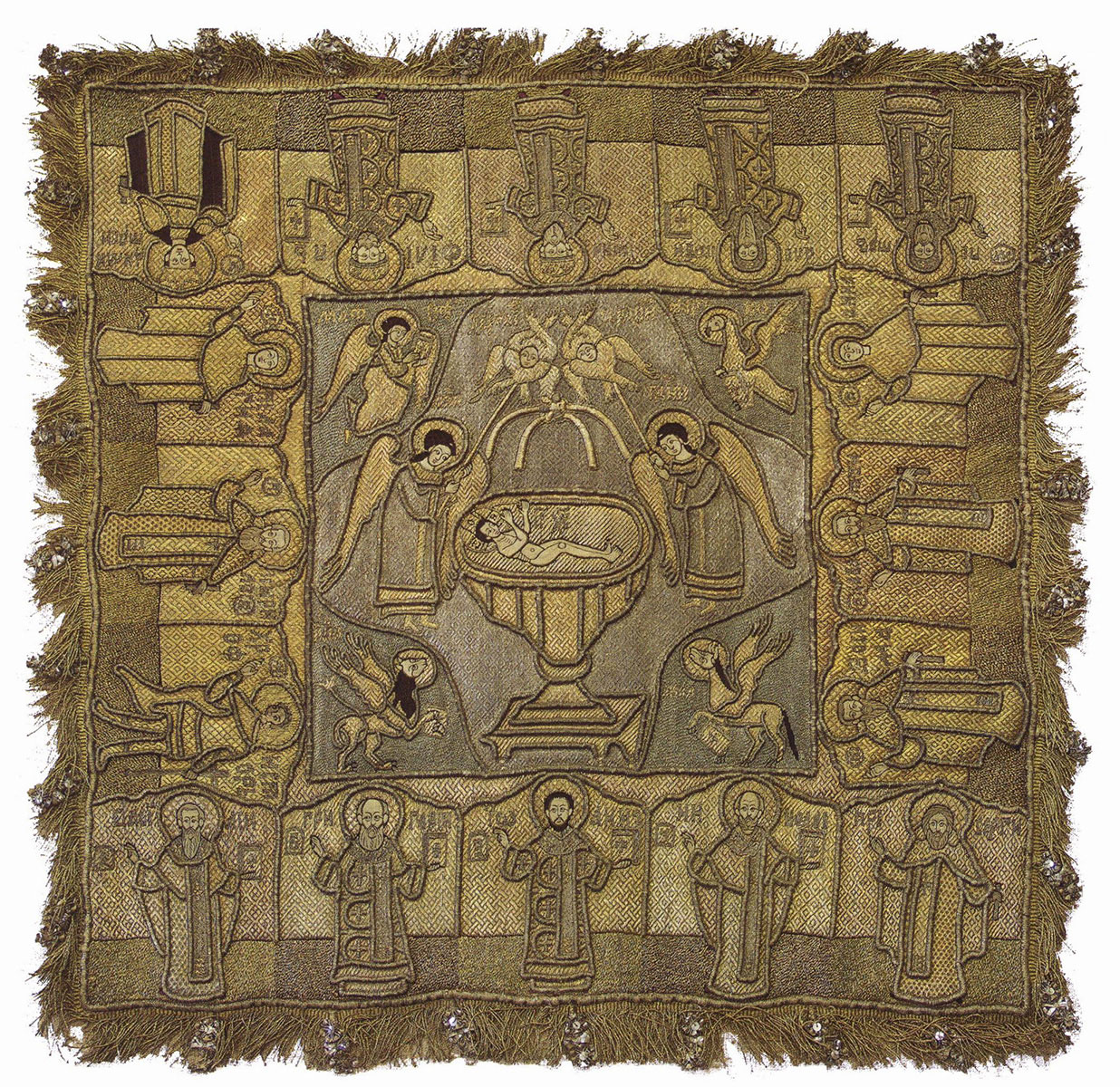 Надписи: ДА МОЛЧИТ ВСЯКАЯ / ПЛОТЬ Ч(Е)Л(ОВЕ)ЧА И ДА СТО/ИТЬ С СТР(А)ХОМ И ТРЕ(ПЕ)ТОМ И НИЧТО ЖЕ ЗЕМНА//ГО В СЕБЕ ДА ПОМЫ/ШЛЯЕТЪ Ц(А)РС(ТВ)УЮЩИМЬ И / Г(ОСПОД)Ь ГОСПОДСТВУЮЩИМЪ Х(РИСТО)С Б(О)ГЪ/Н(А)ШЬ ПРОИСХОДИТ// ЗАКЛАТИСЯ И ДАТИСЯ/ В СНЕ(ДЬ) ВЕР(НЫ)М ПРЕИДУТЬ ЖЕ/ СЕМУ ЛИЦИ А/ГГЕЛСТИИ СЪ В(С)//ЕМИ НАЧА/ЛИ И ВЛАСТИМИ И/ МНОГООЧИТАЯ ХЕРУВИМИ/ ШЕСТОКРИЛИЯ (на кайме между медальонами со святыми искусно «вплетена» литургическая надпись. Текст шит сложной тонкой вязью в две нити вытянутым шрифтом слева направо по периметру каймы).