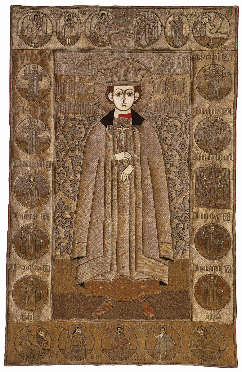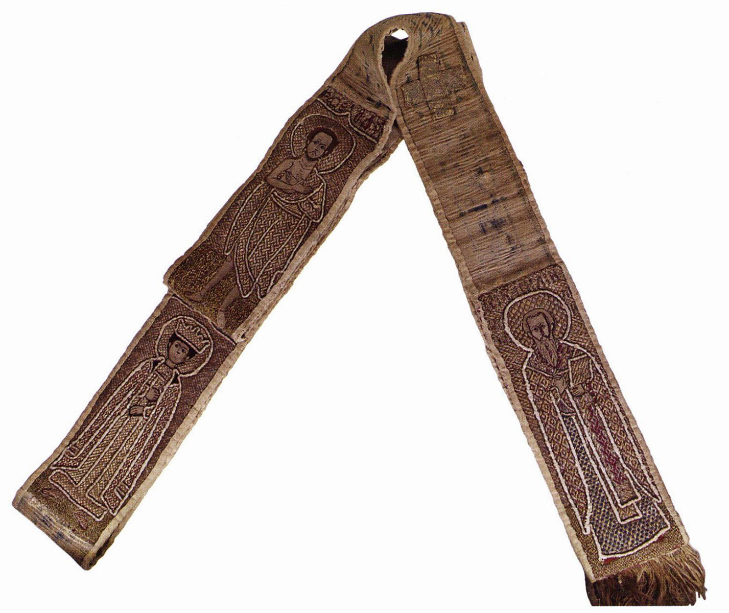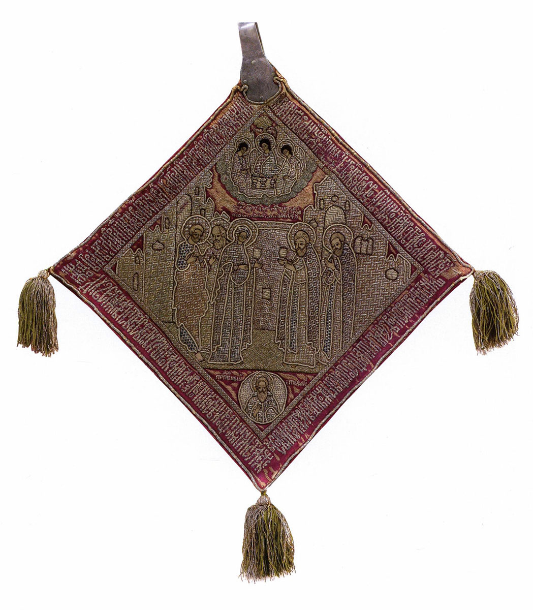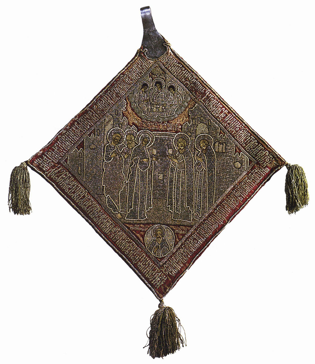 На лицевой стороне вышиты изображения Иоанна Богослова, Николы, мученика Никиты и мученицы Анисьи.
