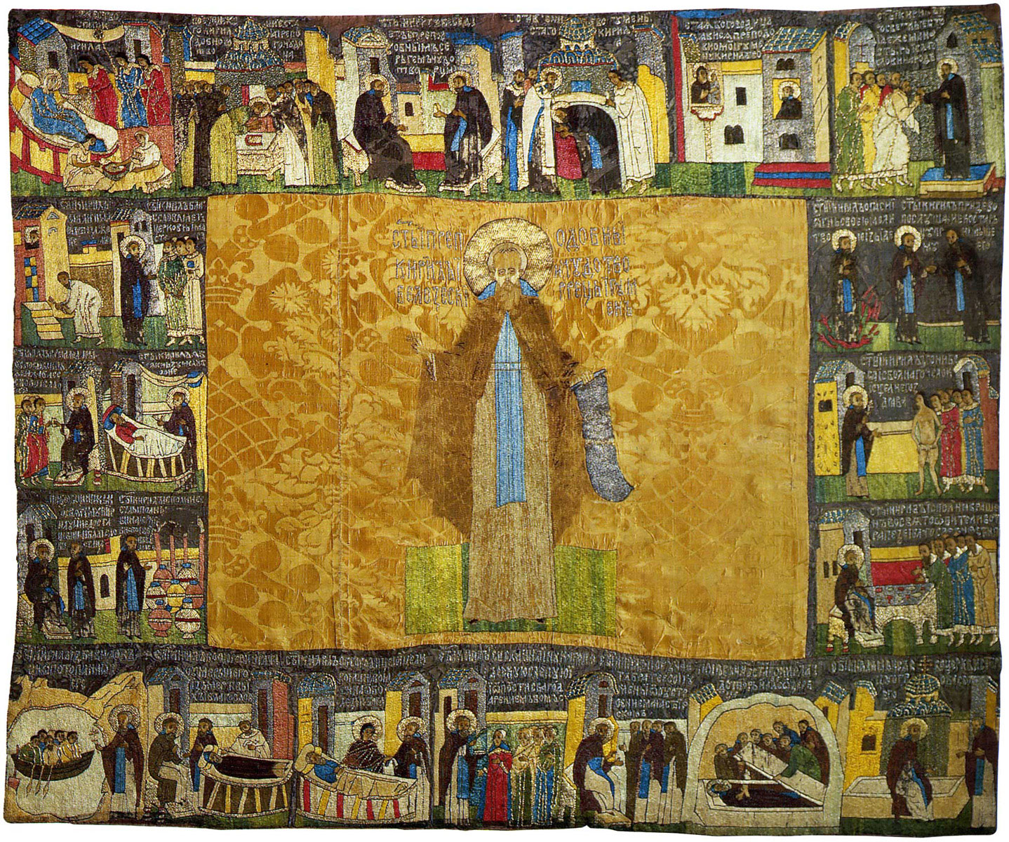 Пелена с изображением Преподобного Кирилла Белозерского, с житием в 19 клеймах.