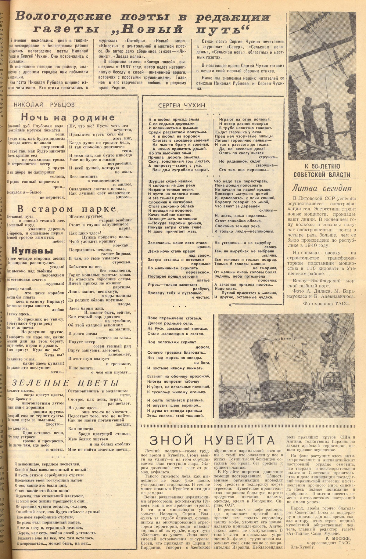 В 1966 г., когда Николай Рубцов первый раз посетил Белозерск и принес в редакцию местной газеты свои стихи, «районка» называлась «Новый путь». В ней печатались годовые отчеты колхозов, новости партийной жизни, статьи о работе сельских клубов и библиотек, о достижениях науки и техники, о передовиках производства, о социалистическом соревновании в трудовых коллективах, о жизни народов разных стран, борющихся за свою независимость. Четвертая полоса, как правило, отводилась под сатирические материалы, литературные публикации, статьи по истории края и советы по домашнему хозяйству. Иногда здесь публиковали ответы корреспондентов и работников сферы обслуживания на вопросы читателей. Главным редактором газеты в то время был Николай Гаврилович Виноградов, одним из корреспондентов – Леонид Беляев. В 1960-е годы редакция располагалась в старинном двухэтажном здании, принадлежащем когда-то купцам Сераго, по адресу: Советский проспект, д. 74.