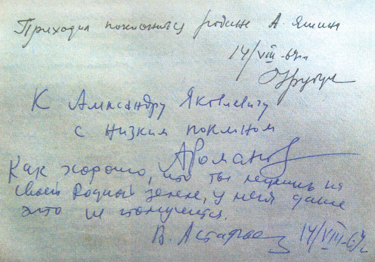 Фрагмент Книги отзывов в мемориальном доме А. Я. Яшина на Бобришном угоре с автографами Николая Рубцова, Александра Романова и Виктора Астафьева