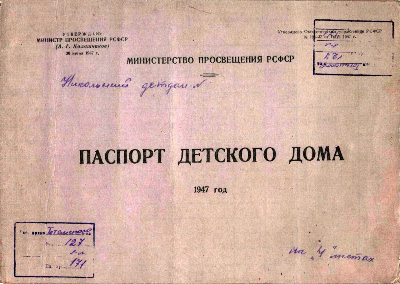 В 1937 году в селе Никольском был открыт детский дом, рассчитанный на 70 детей школьного возраста. Располагался он в двух зданиях. В административном корпусе находились канцелярия, медицинский кабинет, столовая, кухня, квартира директора. Во втором здании были спальни воспитанников. В октябре 1943 года воспитанником Никольского детского дома стал Коля Рубцов. Здесь он прожил до июня 1950 года.