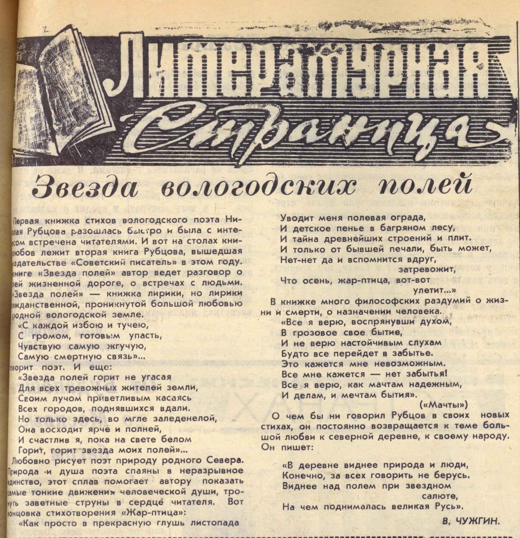 Публикация стихов Николая Рубцова в газете «Волна», 1967 г., 26 октября