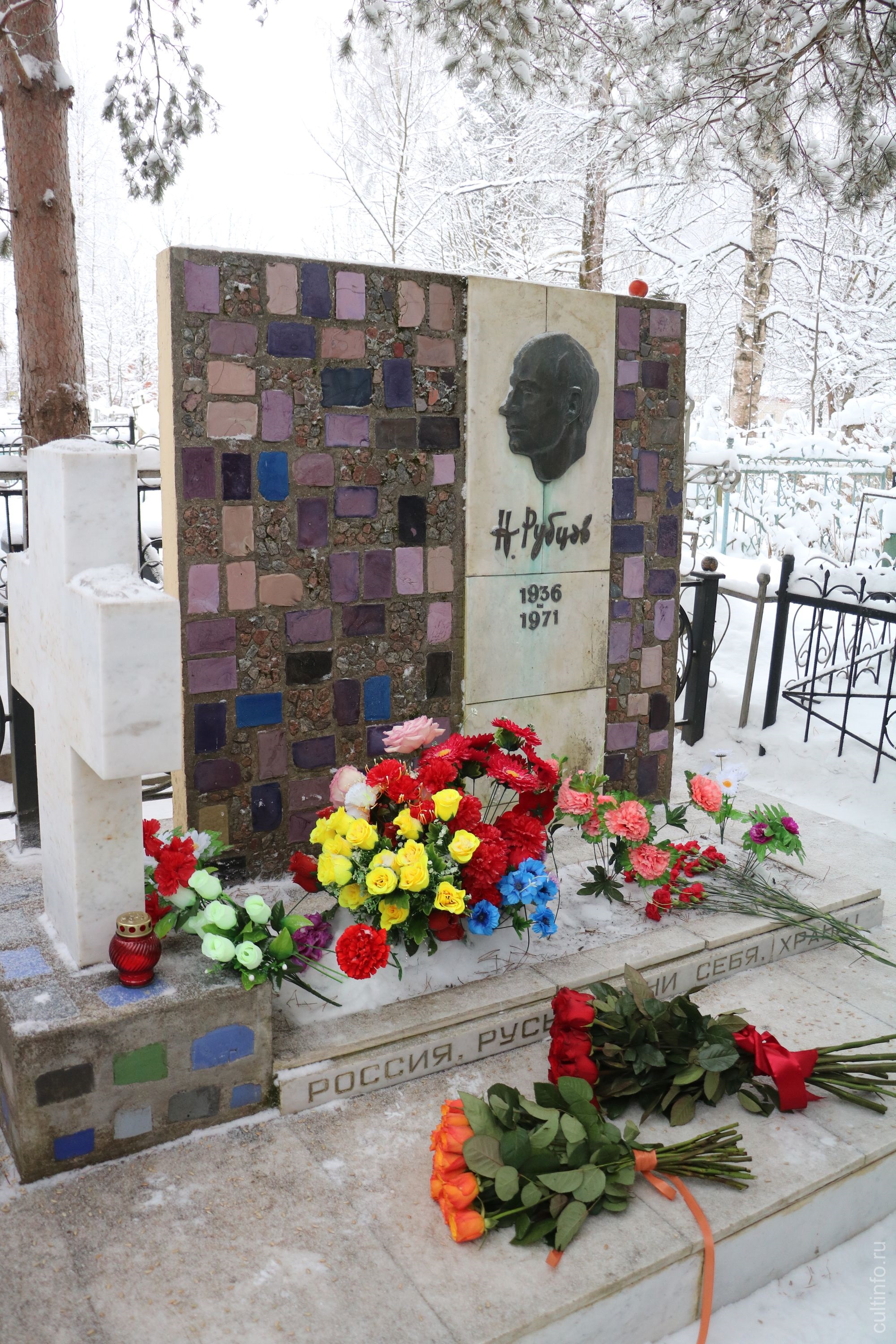 «Похоронен Н. М. Рубцов на городском кладбище. 17 ноября 1973 г. на могиле поэта открыт памятник, представляющий собой прямоугольную стелу, облицованную смальтой. На стеле справа укреплена вертикальная полоса белого полированного мрамора с бронзовым барельефом и автографом поэта, ниже годы жизни – 1936–1971. Стела установлена на бетонном основании. Место захоронения окружено цветником из белого мрамора. На лицевой стороне цветника выбита строка из стихотворения Н. М. Рубцова «Видения на холме»: «Россия, Русь! Храни себя, храни!» Автор памятника художник В. А. Малыгин».