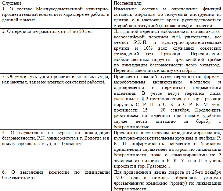 Из протокола собрания Междуведомственной культурно-просветительной коллегии при Грязовецком отделе народного образования.