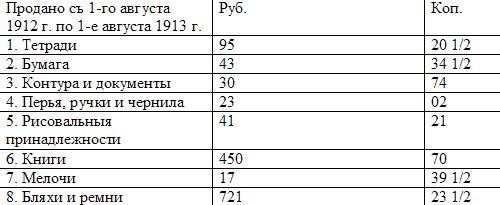 Съ нынешняго года потребительный складъ пр школе началъ функционировать на более правильныхъ основанияхъ. Въ начале учебнаго года былъ выработанъ проектъ устава, который затемъ поступилъ на разсмотрение и утверждение Общаго Собрания учениковъ. Выработанные бланки документовъ и составленная инструкция по счетоводству способствовали лучшему ознакомлению со счетоводными книгами и дали возможность привлечь къ ведению книгъ всехъ учениковъ последняго класса. Между ними были распределены книги, которыя имъ нужно было вести въ течение всей недели. Во второмъ полугодии вспомогательныя книги поручались уже ученикамъ 2 класса.