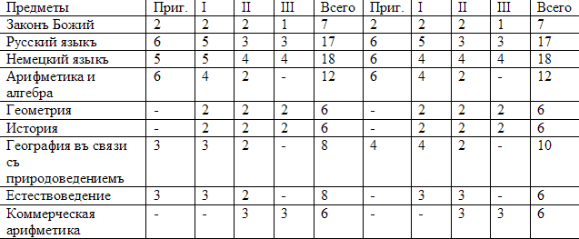 Сверхъ того въ каждомъ классе было по одному уроку пения и съ 1913-14 уч. года – по одному уроку гимнастики. Практические занятия по товароведению и природоведению велись по группамъ въ 10 - 12 человекъ отъ 5 до 7 часовъ вечера.