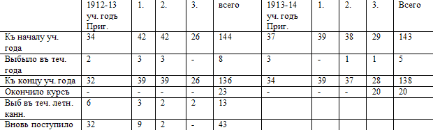 Согласно уставу занятия начинались съ 16 августа и продолжались въ 1913-14 г. до 1-го, а въ 1912-13 г. до 3 июня.