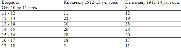 Число экскурсий было незначительно. Въ городе почти не имеется фабрикъ и заводовъ, а продолжительныя дальние экскурсии не доступны, такъ какъ сопряжены съ большими расходами, непосильными для большинства учениковъ.