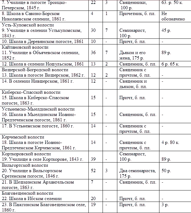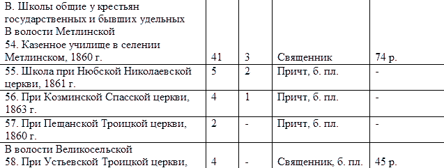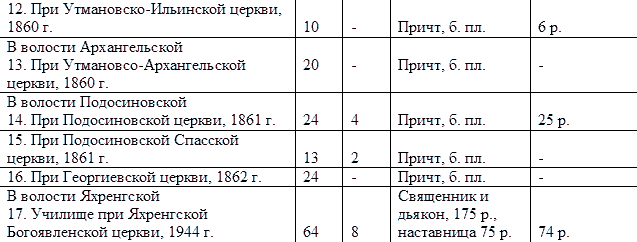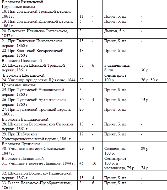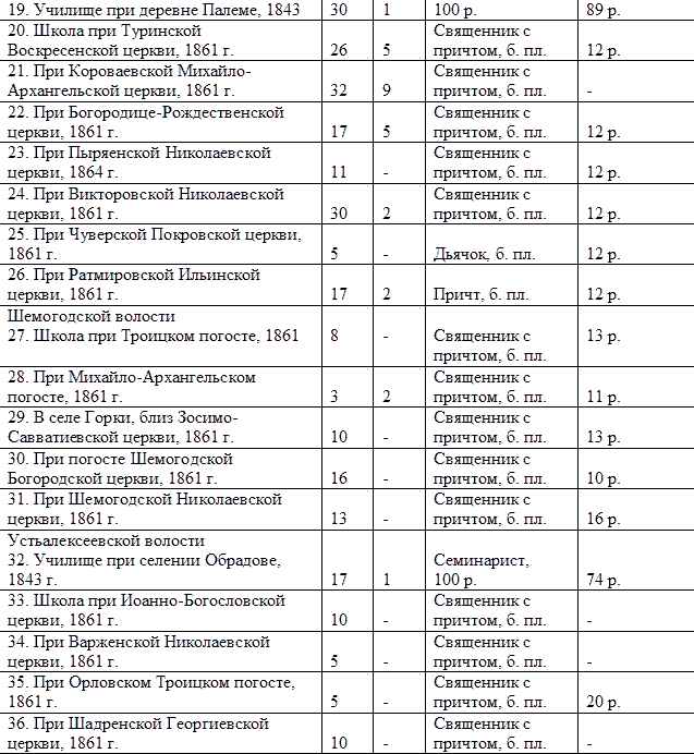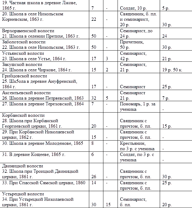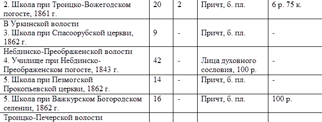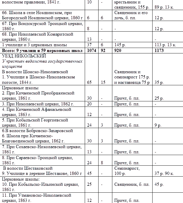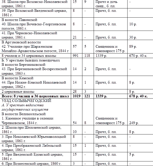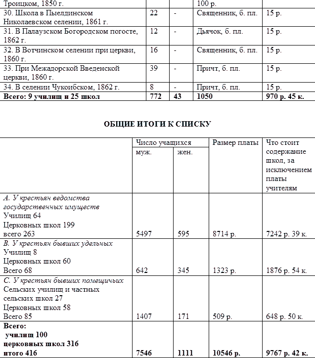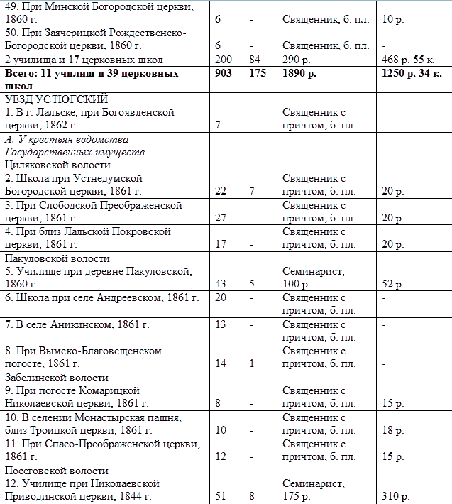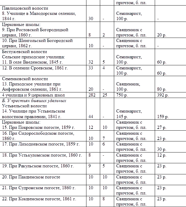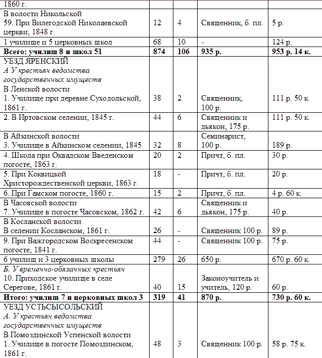 Список сельских училищ и школ в Вологодской губернии // Памятная книжка Вологодской губернии на 1865 и 1866 г. – Вологда, 1866. – С. 1-47.