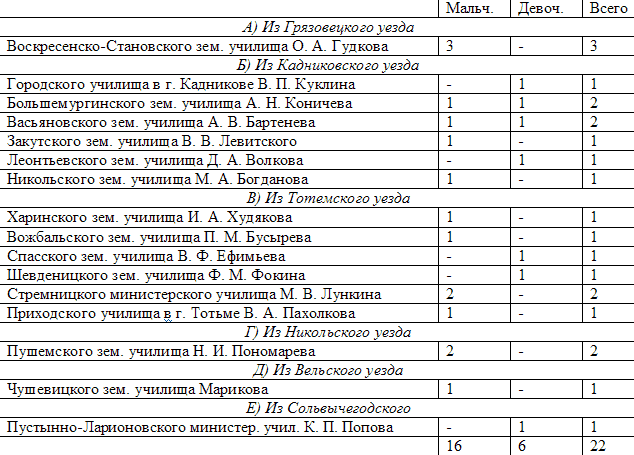 б) в общежитии: 16 мальчиков и 6 девочек, всего 22 человека. Из числа девочек одна, а именно – Фокина Клавдия, дочь учительницы Шевдиницкого училища Тотемского уезда вследствие ходатайства матери по постановлению правления пользуется бесплатным содержанием.