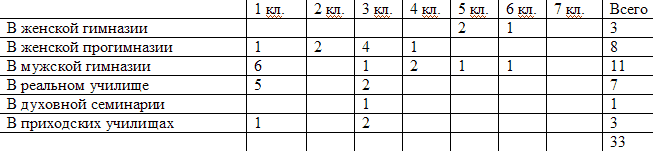 а) в приюте: 7 мальчиков и 4 девочки, всего 11 человек, а именно: 1 – Мезенцев Сергей (обучается в 2 классе городского училища), 2 – Мезенцев Алексей (в 1 классе гимназии), 3 – Мезенцев Василий (в приходском училище), все трое дети умершего учителя Вожбальского училища Тотемского уезда, 4 – Попов Дмитрий (обучается в 1 классе Реального училища), сын умершего учителя Кулойского училища Тотемского уезда, 5 – Попов Николай (в 1 классе Реального училища), 6 – Попов Борис (в приходском училище), оба они дети умершего учителя Шуйского училища Тотемского уезда, 7 – Худяков Николай (учится в приходском училище), сын умершего учителя Харинского училища Тотемского уезда, 8 – Петрова Анна (обучается в 5 классе женской гимназии), 9 – Петрова Елизавета (в 4-м классе прогимназии), обе дочери умершего учителя Сычевского училища Вологодского уезда, 10 – Попова Варвара (в 3 классе прогимназии), дочь умершего учителя Шуйского училища Тотемского уезда, 11 – Худякова Александра (обучается в 3 классе прогимназии), дочь умершего учителя Харинского училища Тотемского уезда.