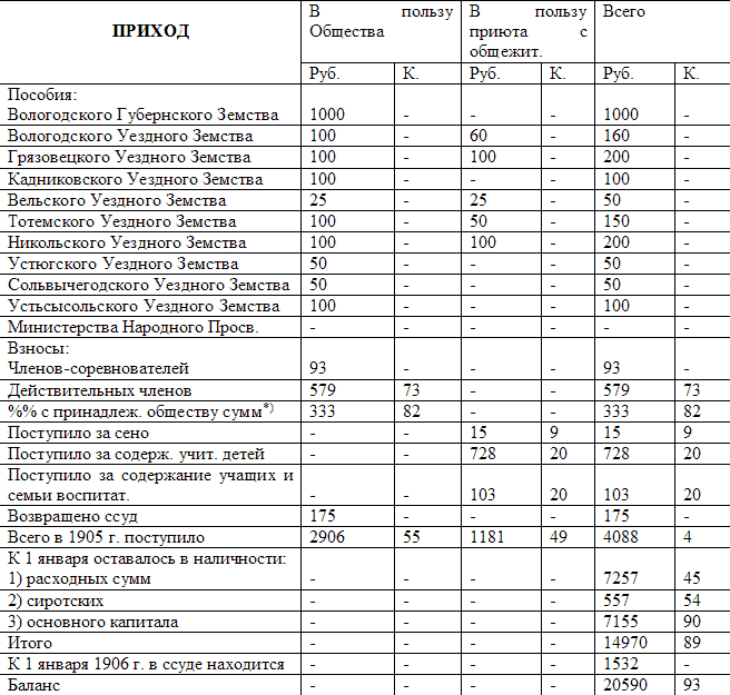*) Не взято из банка %% с бумаг за 1905 г. в пользу общества и приюта-общежития 131 р. 10 коп.