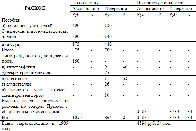 В 1904 г. всего израсходовано на приют-общежитие 3612 р. 52 к., а в 1905 г. - 3730 р. 68 к.