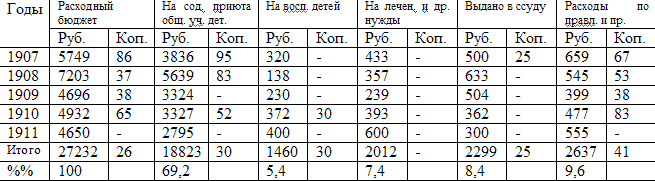 Из этих цифр видно, что львиная доля общественных средств идет на удовлетворение нужд семейных учителей, а именно: на содержание интерната и на выдачу пособий учащим на воспитание детей (69,2+5,4=74,6%).
