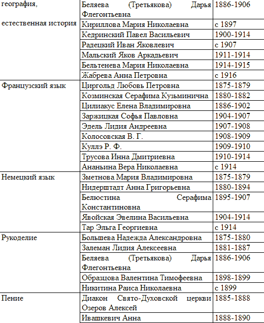 такой глуши, куда весной * В статьях альманаха встречается двоякое написание названия района: Устюженский, принятое до 1954 г., и современное - Устюженский. Интересовались гимназистки и личной жизнью своих педагогов. Девушки старших классов сочувствовали учителю французского языка Р. Ф. Куллэ, после смерти жены приехавшему с дочерью двух лет. Он подружился с классной дамой Ольгой Константиновной Екатерининской. После того как они соединились гражданским браком (Куллэ, вероятно, был католиком), за "безнравственное поведение" им было отказано в преподавании. Молодые учителя навсегда покинули Устюжну в 1910 году. Чувствительные гимназистки осуждали жену учителя реального училища Якова Андреевича Мальского (он преподавал естествоведение в гимназии до 1914 г.), которая, оставив двух детей, сбежала с Борисом Павловичем Бельтеневым, устюженским певцом, учившимся в Италии. Среди гимназисток были популярны литератор Иван Александрович Явойский, высокорослый красавец, и его жена, преподаватель немецкого языка Эвелина Васильевна. И. А. Явойский вел уроки педагогики в VII, VIII классах. В памяти гимназисток навсегда сохранились воспоминания о начальнице гимназии Марии Артуровне Никольской. Это была стройная дама, всегда подтянутая, выше среднего роста. Она носила красивые платья, волосы заправляла наверх. Своей гордой осанкой Мария Артуровна напоминала актрису Ермолову. Встречая учениц у входа, она всегда следила, чтобы была безукоризненность в их одежде и прическах. Обращение было ласковое и только на "Вы". Однако все боялись ее, но одновременно и восхищались ею. Мария Артуровна была строга к себе и к другим. Ее уроки французского языка запоминались надолго, урок никто не смел не выучить. Она лично руководила драматическим кружком, привлекая к этому артистов любительского драмколлектива Устюжны, организовывала вечера и праздники. А вот что мы читаем о Марии Артуровне в отчетах земства за 1909 год: "Гласный Ф. И. Раевский, как член педагогического совета гимназии, указал на то, что прекрасная постановка педагогического дела в учебном заведении обязана в значительной мере труду начальницы гимназии М. А. Никольской. Собрание постановило: выразить ей признательность земства, а о заслугах Никольской довести до сведения попечителя Санкт-Петербургского учебного округа"20. Среди педагогов гимназии было много прекрасных людей, все знания и любовь отдававших ученицам, среди них П. В. Кедринский, Д. Н. Моденский, О. С. Орнатская, Е. А. Добровольская, А. А. Певцова и др. Двадцать пять лет отдала гимназии учительница приготовительного класса Анна Алексеевна Певцова. Родом из помещичьей семьи, она не постеснялась идти в учительницы. С 1880 года, с момента создания в гимназии приготовительного класса, стала его первым учителем. Своим ученицам она показывала пример благородства и порядочности. Знавшие Анну Алексеевну любили ее за прямоту и правдивость. С 1880 года преподавал Закон Божий священник Богородице-Рождественского собора Иоанн Васильевич Казанский. За усердную службу на должности законоучителя в 1894 году он был награжден камилавкою, а в 1896 году - нагрудной серебряной медалью на Александровской ленте, с 1899 года был членом Устюженского училищного совета. Иоанн Васильевич не только давал знания, но и воспитывал у своих учениц высокие моральные качества. С 1909 