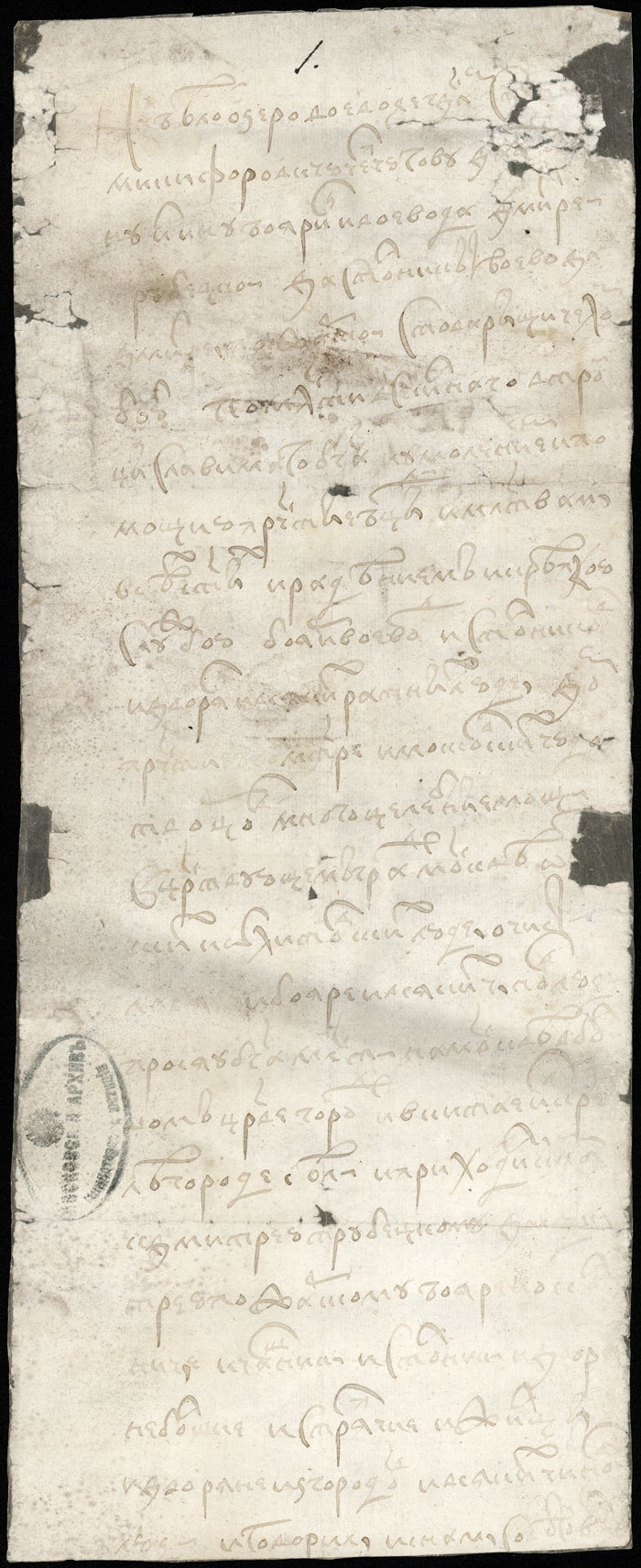 1612 г., ноября 19. Грамота «Совета всей земли» на Белоозеро воеводе С. Н. Чепчугову и дьяку Б. Ильину о присылке на Земский собор для избрания царя десяти человек от посада и уезда. РГАДА.