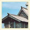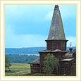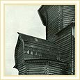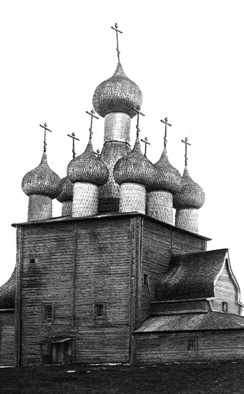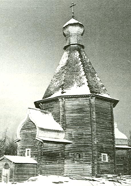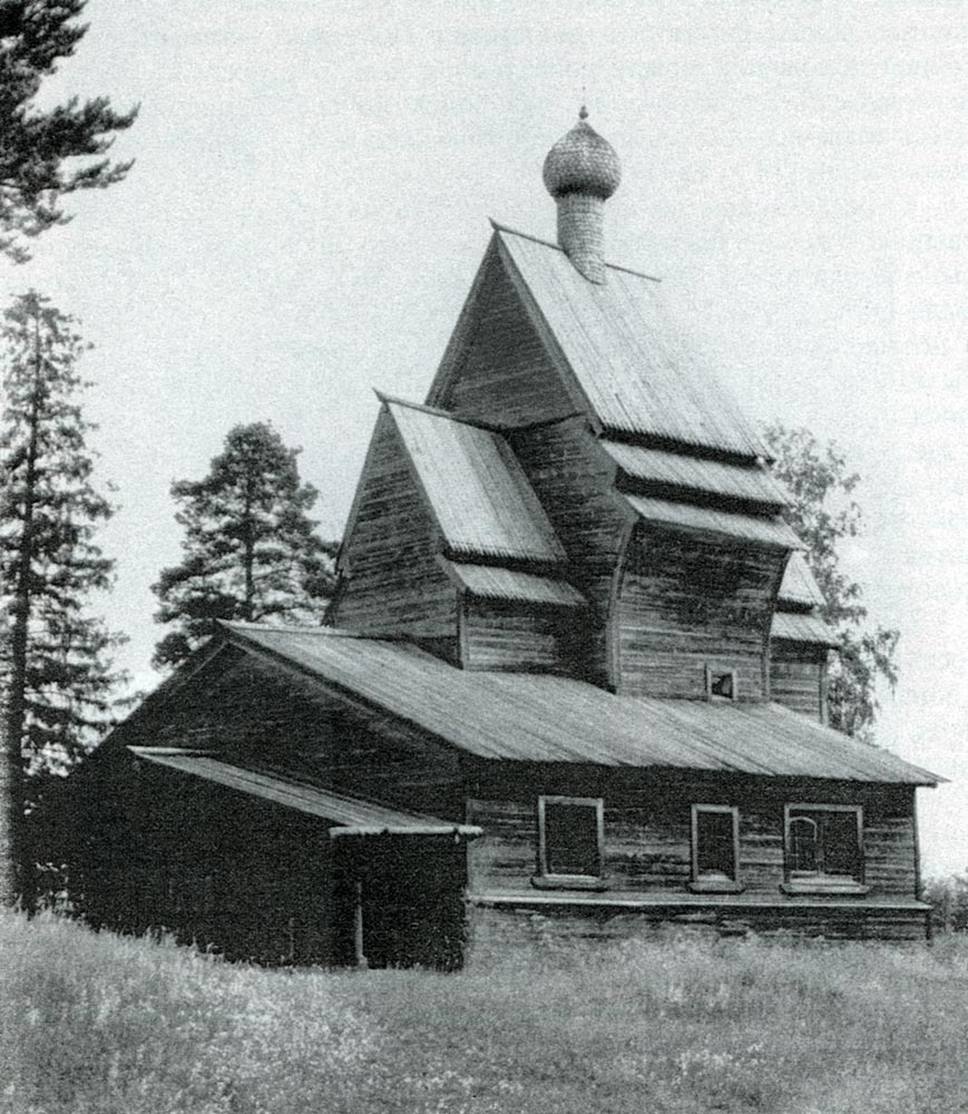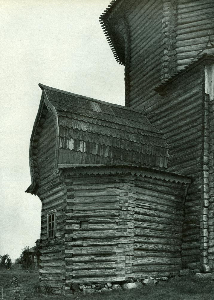 кроме того, что является одним из древнейших сохранившихся памятников деревянного зодчества, в своем архитектурном решении предположительно несет отголоски древних новгородских традиций, выражающихся в устройстве каскадных покрытий. Трехступенчатые скаты встречаются редко и, похоже, относятся к наиболее архаичным приемам. Фото автора 2000