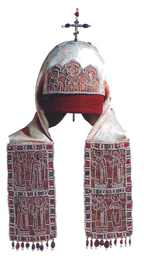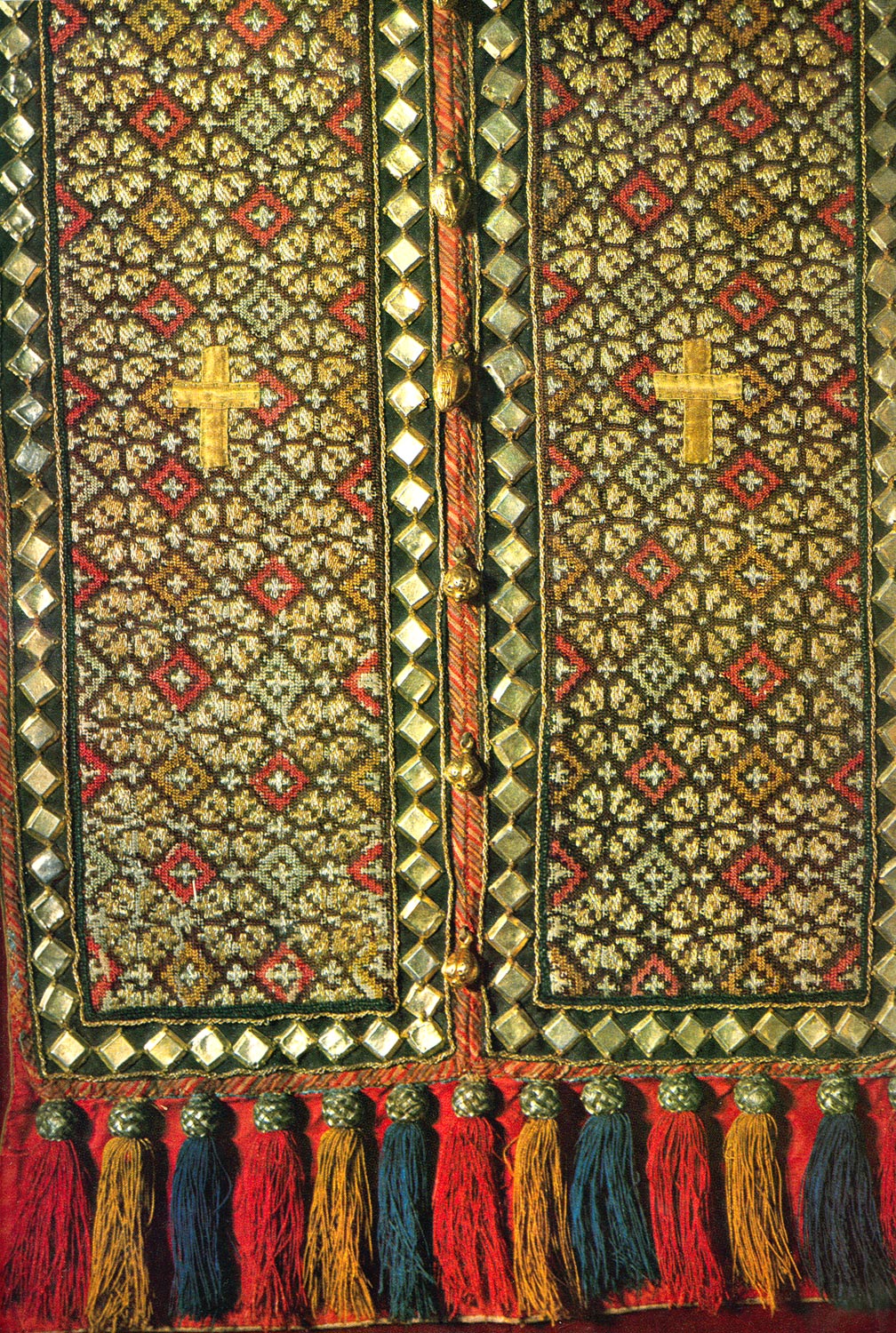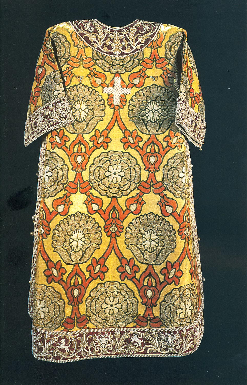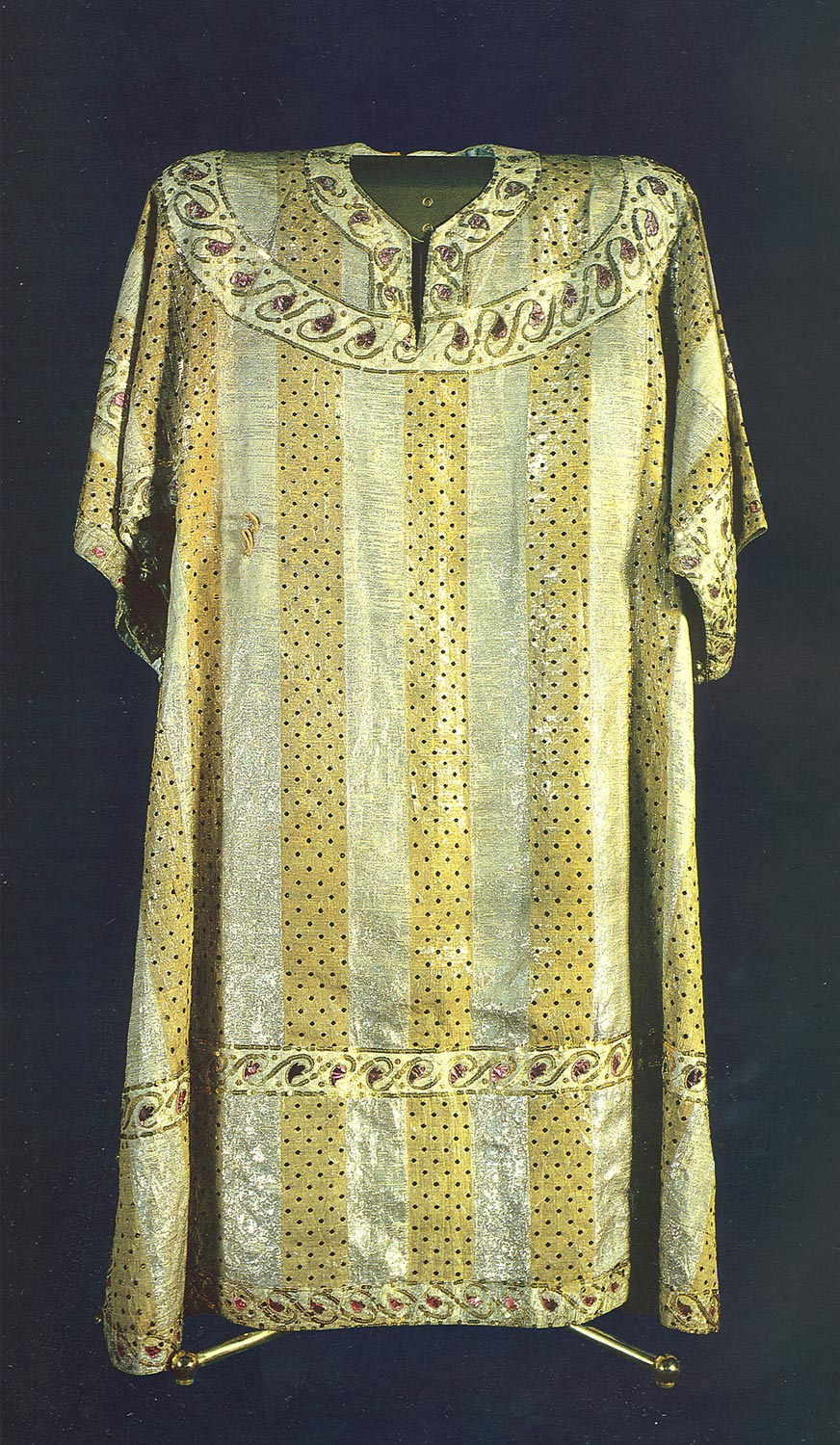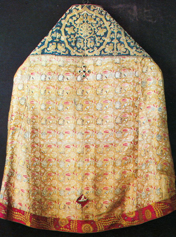 Сшит из шелковой византийской ткани в 1364 г. Украшен золотыми дробницами с перегородчатой эмалью первой трети 13 века. Шитье жемчугом 14 века